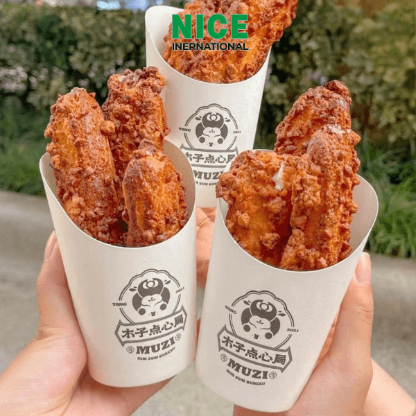 Hộp đựng khoai tây chiên là sản phẩm bao bì thực phẩm được làm từ giấy Kraft cao cấp, bên trong được tráng lớp PE chống thấm dầu – nước, giúp bảo quản tốt các món chiên nóng giòn như khoai tây chiên, cá viên, xúc xích, bánh nướng… Nhờ thiết kế tiện dụng, nhiều kích thước đa dạng và khả năng giữ thực phẩm sạch sẽ, sản phẩm được sử dụng rộng rãi tại các quán ăn vặt, trà sữa xiên que, quầy line siêu thị, xe đồ ăn nhanh và các chuỗi food take-away.