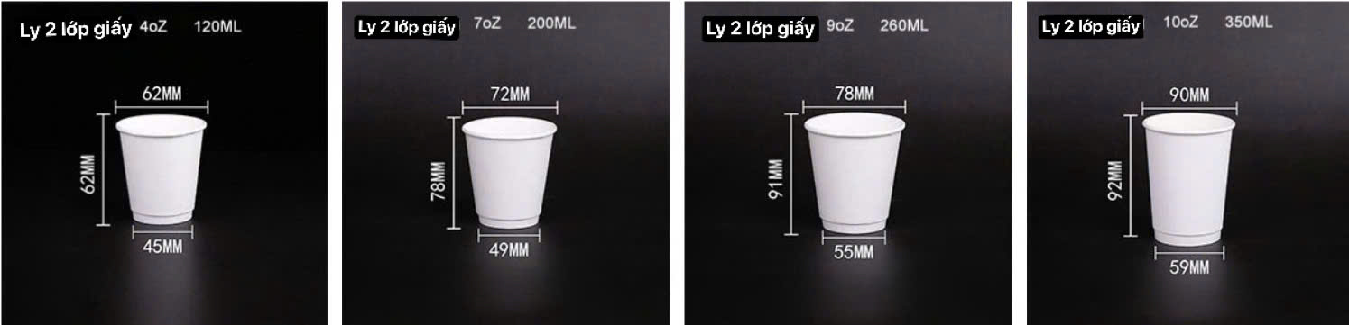 | Ly 2 lớp giấy | Quy Cách (oz) | Thể Tích (ml) | Đường Kính Trên (mm) | Đường Kính Dưới (mm) | Cao (mm) | Số Lượng/bao (pcs) | Số Lượng/ thùng (pcs) | Kích Thước Thùng Carton(cm) |