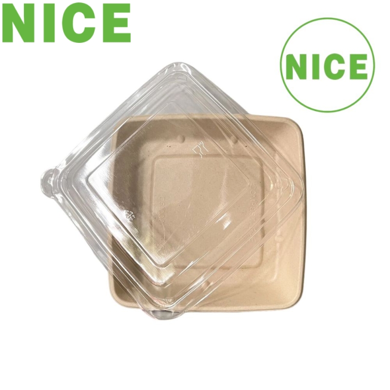 Hộp bã mía kèm nắp nhựa PET, PP và nắp bã mía.